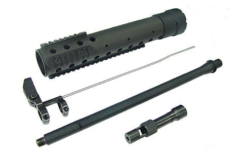 This is a very rare conversion kit made by CA. This kit comes with flip up front sight, fake gas tube, one piece outer barrel, one piece free floating hand guard with rails, spr style flash hider