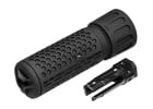 The officially licensed Knight's Armament Company QDC barrel extension is made out of machined aluminum with a steel flash hider for the utmost durability. The matte finish prevents reflection from sunlight as well as protecting the mock suppressor from rust and heavy scratches. The QDC suppressor is unique because of the quick detach mechanism that is true to the real steel version's form factor and function. The suppressor locks in to place with steel ball bearings that sit against indentations on the flash hider and secured by a spring tension collar. The thread of the flash hider has been modified to fit ONLY on the airsoft version with 14mm threads. With a 1:1 scale to the real steel suppressor and real trademarks from Knights Armament, the Knights Armament Airsoft replica adds amazing realism to any airsoft replica.
