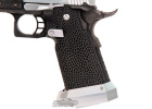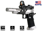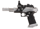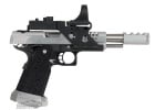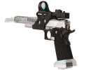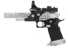 The Airsoft GI Custom F-Chu Too is another hand built pistols from our Master Technician Frank Chu. Frank is an avid IPSC shooter, and his knowledge and experience shooting real guns went into the design of the F-Chu Speed Racer. The base gun is a Tokyo Marui Hi Capa 5.1. The metal slide, compensator, magazine well, magazine base plate, magazine release button, slide catch, and cocking lever are all machined components from aluminum. The grip is a custom work of art that Frank stippled and cut with his own hands. Everything on this gun is built for speed. The red dot sight and integrated mount are included for faster target acquisition. The cocking lever makes pulling back the slide extremely easy and ensures the shooter a solid grip. The magazine well increases reloading accuracy. Finally, since all of the moving parts are CNC machined from lightweight aluminum it takes energy to get them moving. This is a high speed gun inside and out, but it's going to take a high speed shooter to use this gun to it's full potential.