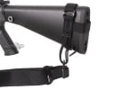 Because airsoft guns with full stocks generally do not have rear sling mounts, AMP offers the 3 Point Sling Buttstock Adapter to allow the user to still use their three point sling on their rifles that have full stocks. The adapter wraps around the buttstock, and has a loop that provides the third sling mount.