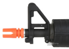 The fusion engine completely takes the place of the AEG's gearbox as a direct drop-in, which means that you no longer have to ever worry about stripped gears, broken pistons, or leaking cylinders. It is powered via a High Pressure Air (HPA) setup and only requires a small battery (7.4v-9.6v NiMH or Lipo recommended) to power the onboard computer, which is referred to as the Fire Control Unit (FCU), and is responsible for adjusting all of the features of the gun. Optional color-coded nozzles are available from PolarStar to be able to move the maximum FPS range either up or down. The PR-15 also uses a standard AEG-style hop-up and inner barrel design, which means it can still accept a large variety of standard AEG upgrade parts. Externally, this gun is extremely appealing. It features a full metal body, metal outer barrel, removable hand guard, realistic triangle front and one-piece rear sights, and a six position LE-style stock.