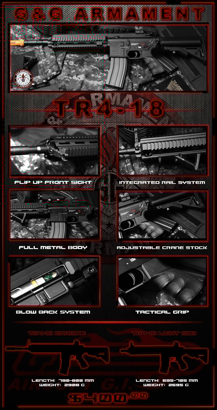 The G&G TR-418 is part of G&G's Top Tech Lineup. The TR-418 has some features that you would not find on other G&G products such as the full metal body with trademarks, functioning forward assist to decompress the spring, as well as the pneumatic blowback system. The internals have been reinforced with different parts for more durability and longevity of the gearbox. All in all the G&G TR-418 was designed similar to the real gun counterpart. The TR-418 is a great AEG for those looking for a little more realism out of their airsoft gun.