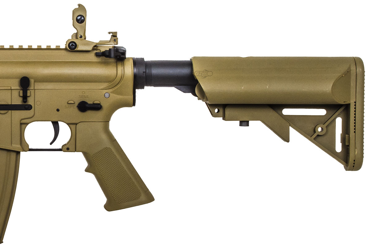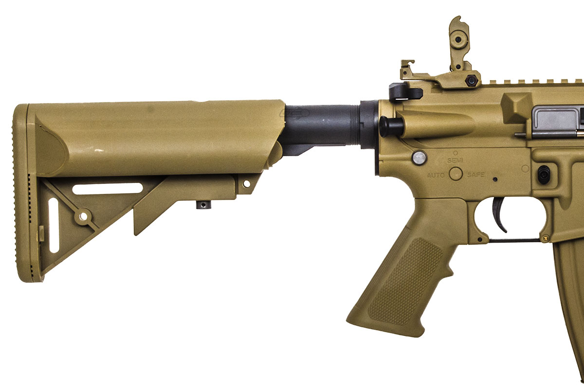 The externals of the M4 SD Carbine feature a free float style handguard, which allows you to customize your rifle with almost any picatinny mounted accessory you can dream of, from scopes to vertical grips or flashlights to lasers. Instead of a boring mock flash hider, this gun features a slick mock suppressor to cap off the barrel giving the gun a tacti-cool special forces styling. Once you have your favorite red dot scope mounted to the rail, the included flip up sights make for a fantastic option to keep you in the fight if the batteries in your scope run dead.