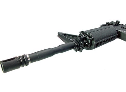 TM M16 Tactical Carbine features a 3 sections outer barrel and secured together by 6 small hex screws. Those combination equals a infamous barrel wobble for the TM M16 Tactical Carbine. The ArmaLite M15A4 features a one piece barrel secured on the metal frame body. That certainly resolved the barrel wobble problem. M15A4 also sports improved material of Hand Grip, Hand Guard and Retractable Stock. |