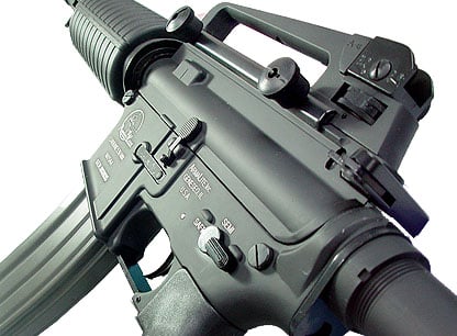 The Armalite M15A4 sports a black finish, laser engraving Armalite logo, and a running serial number. The finish is quite nice compared with their older versions. It featured a detachable metal carrying handle. Unlike the TM plastic body, this metal cast body feels much more solid than the ABS plastic (and there is no ugly burn off from the destroyed trademarks) |