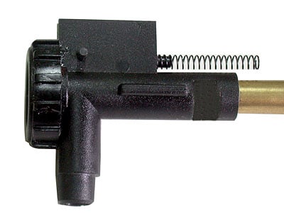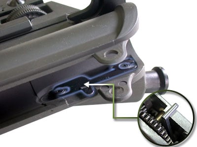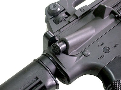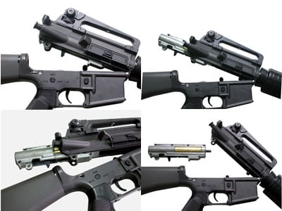 Beside the two piece gearbox design, another new design that was applied to the AEG is the spring tension release button. This spring tension release system also featured in TM Famas and the TM PSG-1, but it is the first in a AEG Tactical Carbine style airsoft gun. The spring tension release button is located at the forward assist button; unlike the TM or CA, the forward assist button is purely cosmetic.