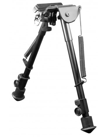 Spring tension bipod for quick withdrawal. Locks securely with multiple points of adjustment, and clamps to the common sling studs on most sporting rifles. An additional sling stud is integral with the design, allowing the shooter to use their sling.