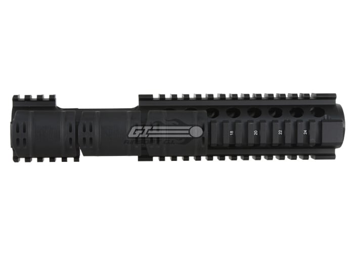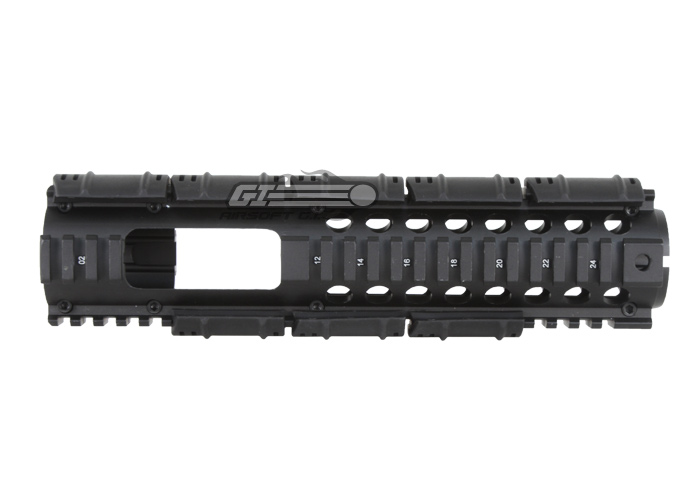 Need more room on your airsoft AR carbine rifle for accessories and modifications? Equip it with the MRE-Style AR Carbine Length 2pc Extended Quad Rail system from AIM Sports. This easy-to-install and highly-functional piece of equipment is meant to replace the standard hand guards or stock tactical rail systems on M4 airsoft guns. The rail has a gap in it to fit your stock triangle front sight, and extends past that toward the end of the barrel. This gives you plenty of real estate for mounting vertical grips, lights, lasers, grenade launchers or most any other accessory that you could want on your airsoft gun. With professional-grade metal construction and a sleek black finish, the AIM Sports MRE-Style AR Carbine Length 2-Piece Extended Quad Rail system is built to perform and designed to impress. It will look great on any M4 in your arsenal. No matter how you're trying to deck out your M4 airsoft, this high-performing 2-piece extended rail system will give you the space and stability you need to put together the ultimate airsoft weapon. Order yours with safe and secure shipping here at Airsoft GI and start modifying your airsoft M4 rifle today!