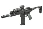 This super rare style of custom was built around a Sig Sauer Proforce MCX Virtus Carbine AEG, a rifle that performs and looks incredible out of the box. To meet the demand for shorter sbr style builds we installed a Laylax short handguard and outer barrel set specifically designed for the MCX. This new handguard still allows for aftermarket accessories such as the Tac 9 PEQ seen attached to the rifle. Attached to the new outer barrel is a Bravo 5.2 Tracer Unit, perfect for CQB firefights in the dark. The optic used for this build is a Lancer Tactical red/green dot reflex sight that comes with a riser so you can comfortably rest your cheek while aiming and not have to struggle to use the optic. The original pistol grip was also swapped out for a Tac 9 BR AEG pistol grip, a much more comfortable grip compared to the original, and it comes in one of the "cool guy" colors; wolf gray!