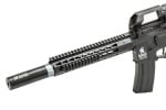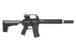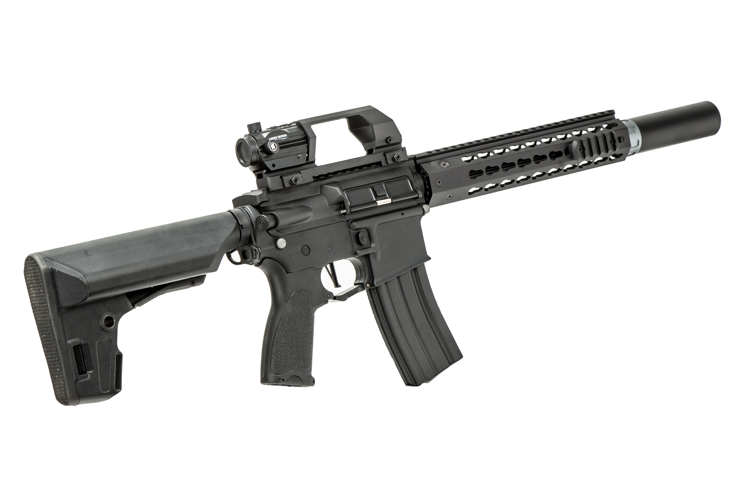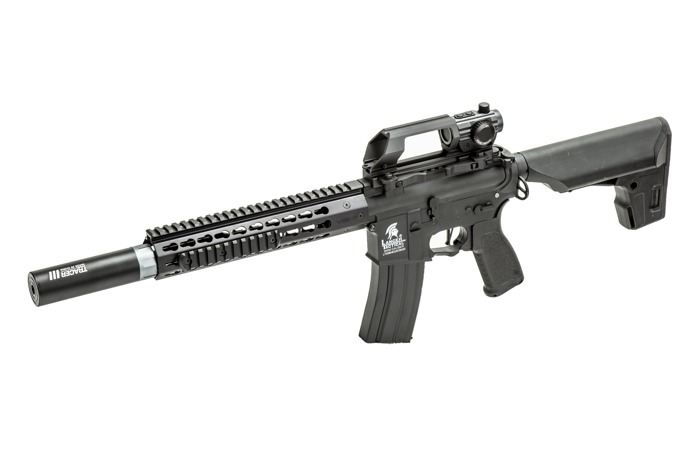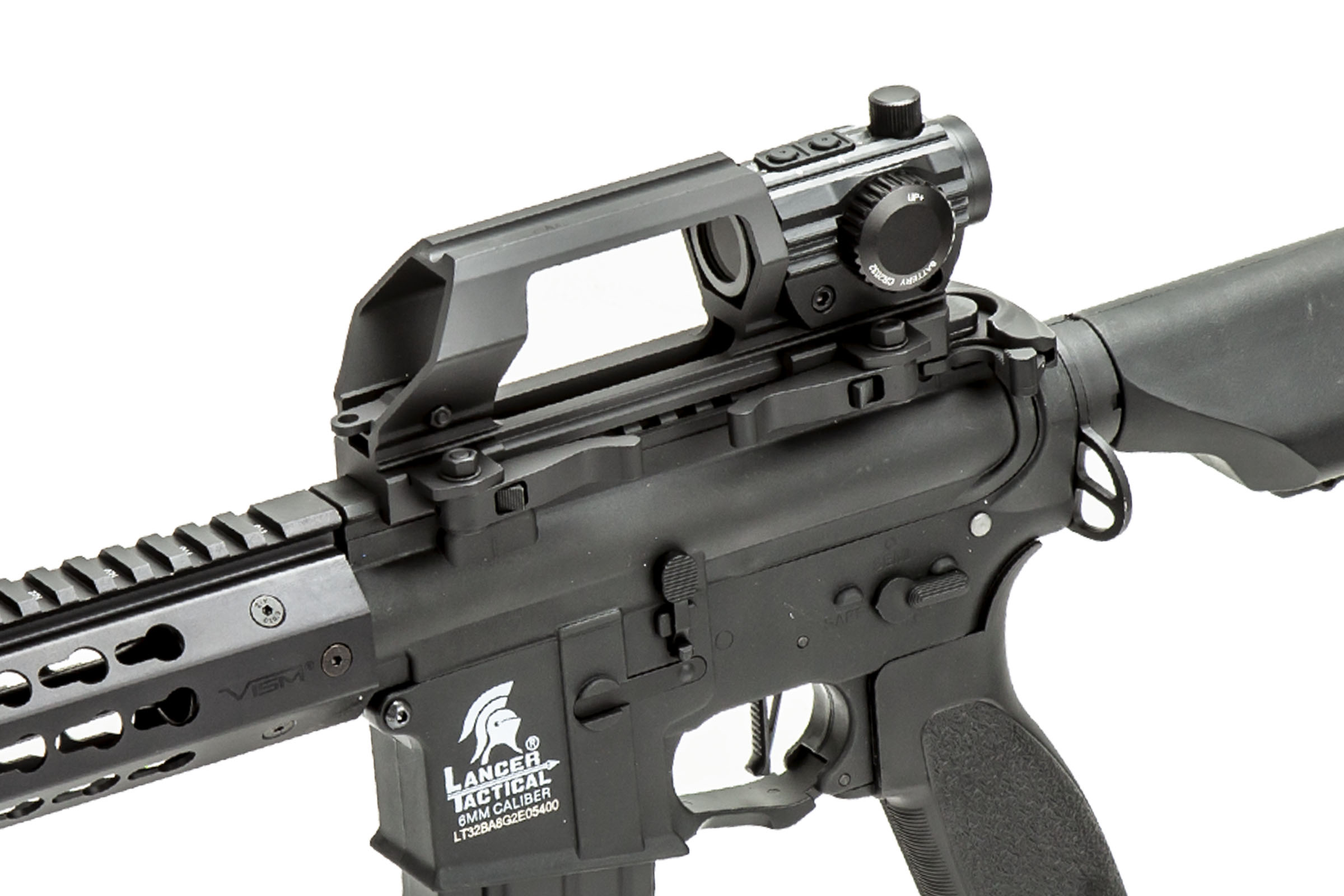 This custom was built around a Lancer Tactical LT-32BA8-G2-E 8" Hybrid, so the receivers will be polymer built. The outer barrel boasts a new Bravo 5.2" Tracer Unit so you can easily ntrack your BB's trajectory and more easily confirm your kills. Gone is the original rail, and in its place VISM M&P 15-22 Keymod 10" Free Float Handguard. For better aiming, we've added a Lancer Tactical 1x30 mini red dot sight as its proven to be an incredibly reliable and simple to use optic. Encompasing the new optic is a VISM Gen 2 Optic Mount Carrying Handle. Even the original stock was substituted for a PTS EPS, the stock that holds the record for most amount of battery space.