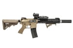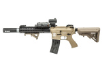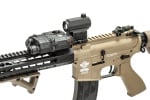 The base for this savage custom was a G&G GC16 Raider-L AEG, so you know you're getting a reliable platform that will accept almost any aftermarket component. A new DBoy outer barrel sits nice and cozy within the confines of a new VISM AR-15 10" Keymod rail, a much more streamlined and modular system compared to the original handguard, and sports a UK arms angled foregrip. And at the tip of the new set-up is a Bravo 5.2" Tracer Unit so the user can fight in total darkness. A PEQ-15 sits on the rail to assist with target designation and illumination, and the micro red and blue dot sight woks wonders in a CQB environment. As per GI tradition, a pair of KAC sights can be found supporting the optic in the event of a failure with the optic's electronics. Even the rear has been modified with an E&L slim SOPMOD stock, giving the rifle a more low profile appearance and feel.