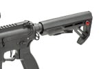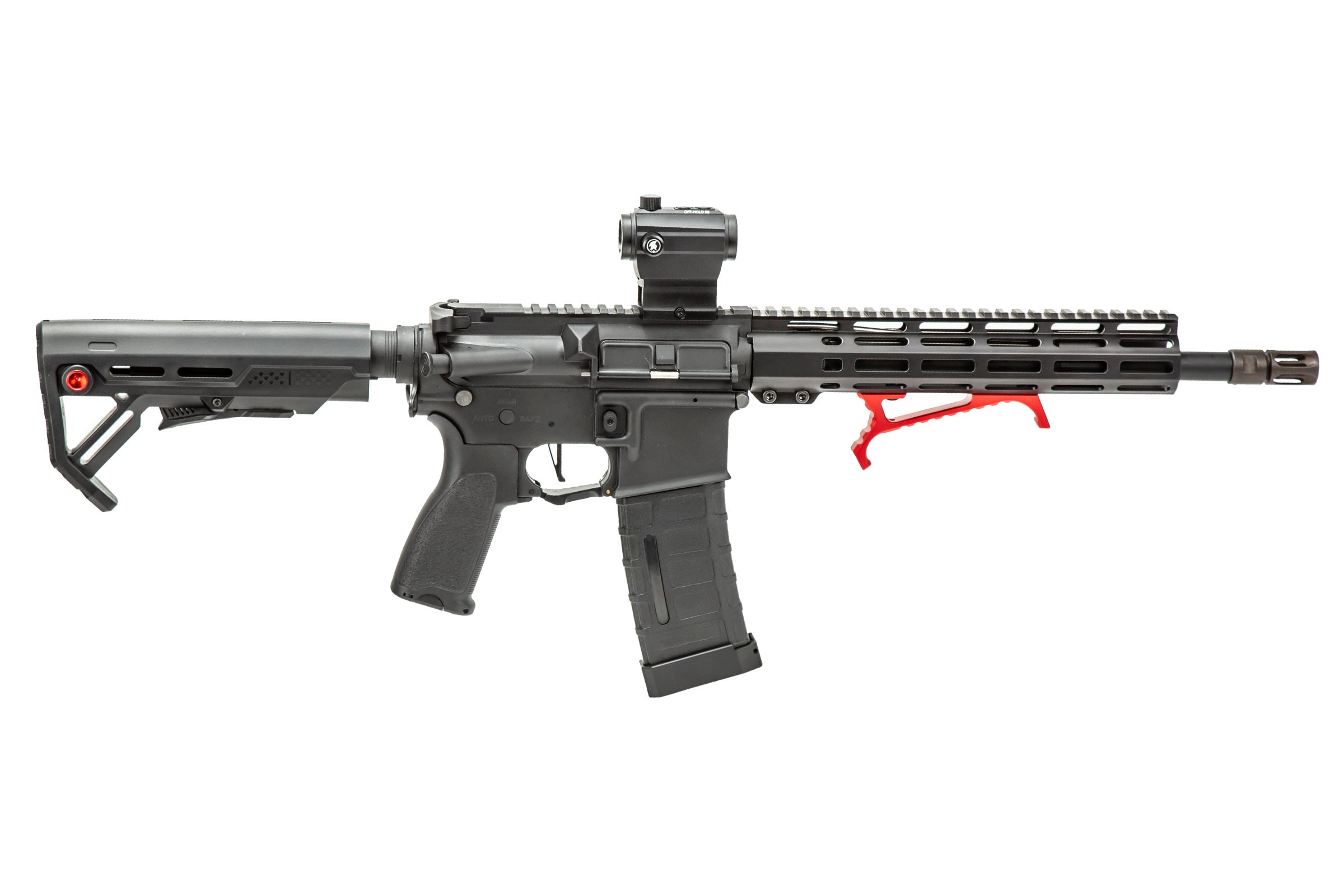 This custom was built around an Enforcer Hybrid Gen 2 Battle Hawk 7" Rail AEG as they make for great base models. Replacing the stock flash hider is a Classic Army VL Flash Hider Type B for a more aggressive look. The original rail system, while cool in its own right, didn't do it for us so we replaced it with an Arcturus M-Lok rail. The rail is much more streamlined and just aesthetically pleasing. For comfort we added a Ranger Armory M462 Handstop. The optic being used is a Red/Green Dot Reflex sight. Thankfully the optic sits on a decent sized riser so users of bulkier style goggles can still comfortably ADS. For the rear end, the stock in use is a Ranger Armory Collapsible covert rear, a super popular option for those looking for low profile slim stocks.