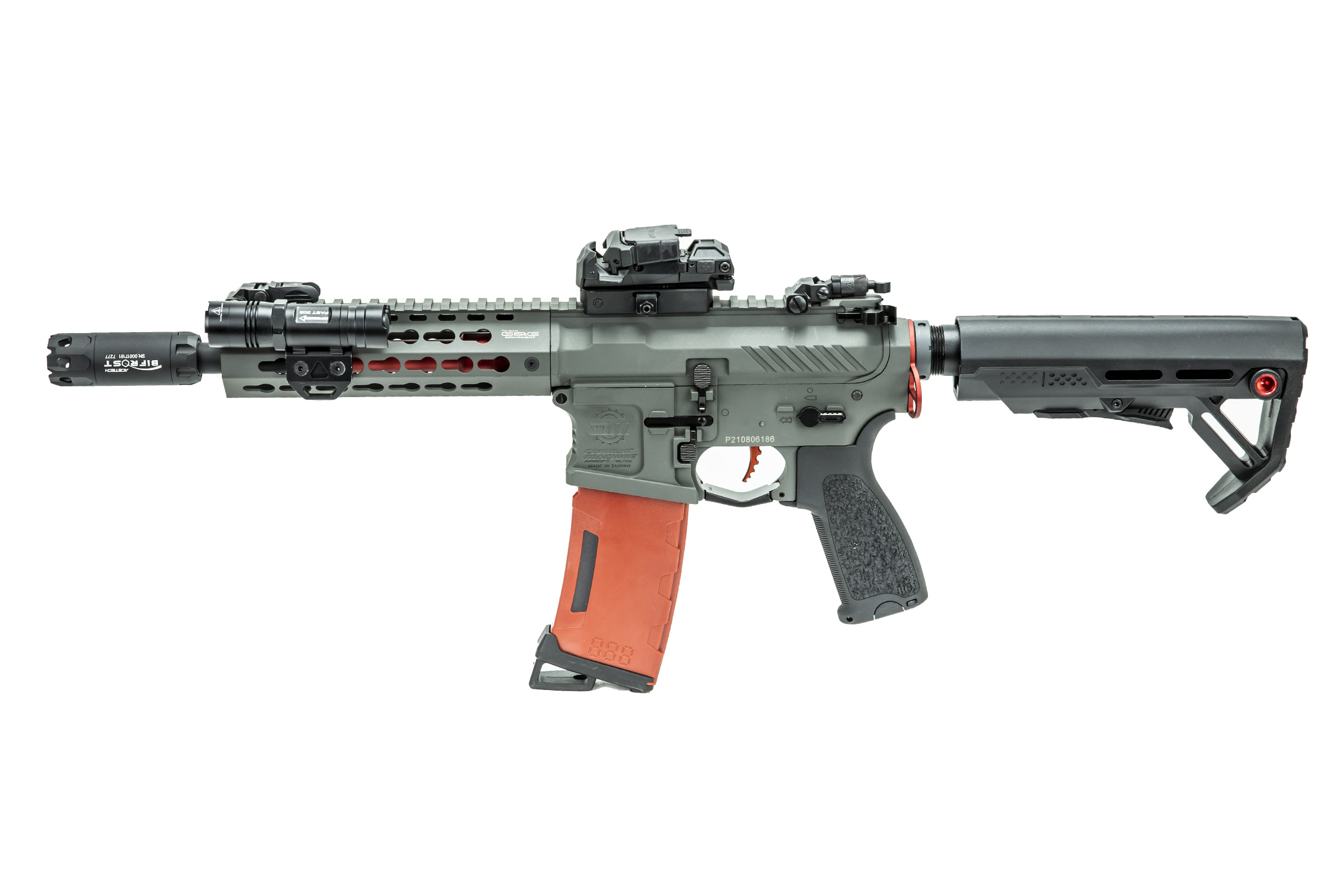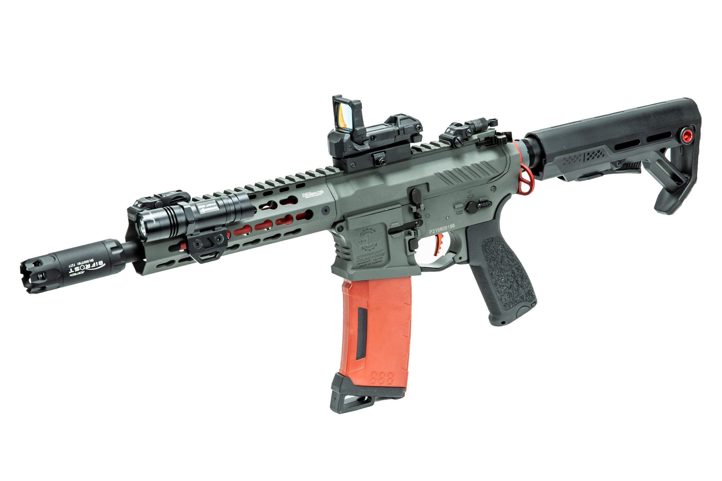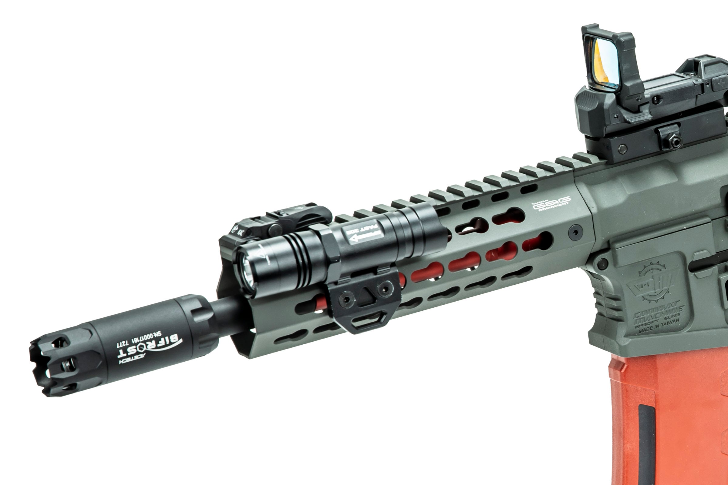 A CM16 SRS M4 was used as the base rifle, and did we ever have plans to evolve this rifle into a grand custom! The majority of the receiver remained the same, however both the outer barrel and sling plate have been replaced by a red variant, really making it pop against the mostly gray rifle. An Acetech Bifrost sits at the end of the new outer barrel, giving the user the ability to shoot tracer rounds in a full RGB spectrum. An Opsmen FAST weapon light makes for a viable for blinding or disorientating an opponent in a CQB environment. A VISM V-Solar FlipDot was chosen as the optic for this custom due to its compact size, and snazzy means of deploying. Foir added comfort, the pistol grip inuse is a BCM Gunfighter pistol grip, one of the most revered in the industry. The original buffer tube and stock were also swapped out for a JG buffer tube and a Ranger Armory Covert stock, one of the more modern and sleek looking stocks on the market. Going along with the red color scheme, we've also included a red Lancer Tactical High Speed mag so you'll have no trouble getting this mag to keep up with insane rate of fire builds.