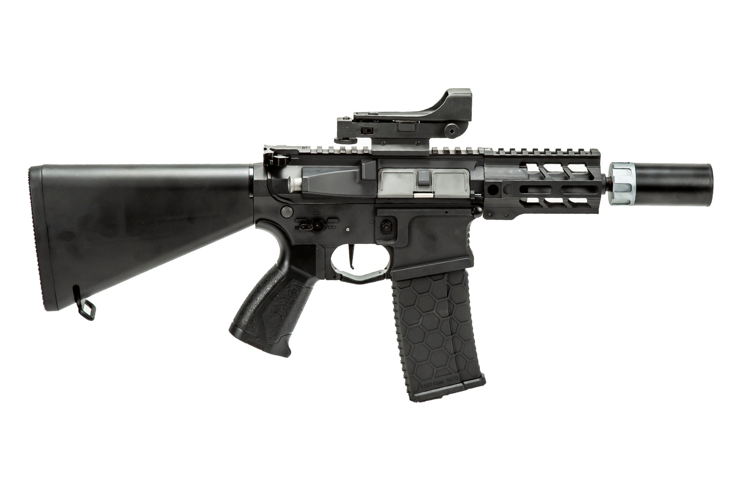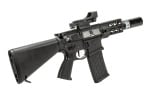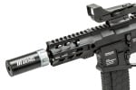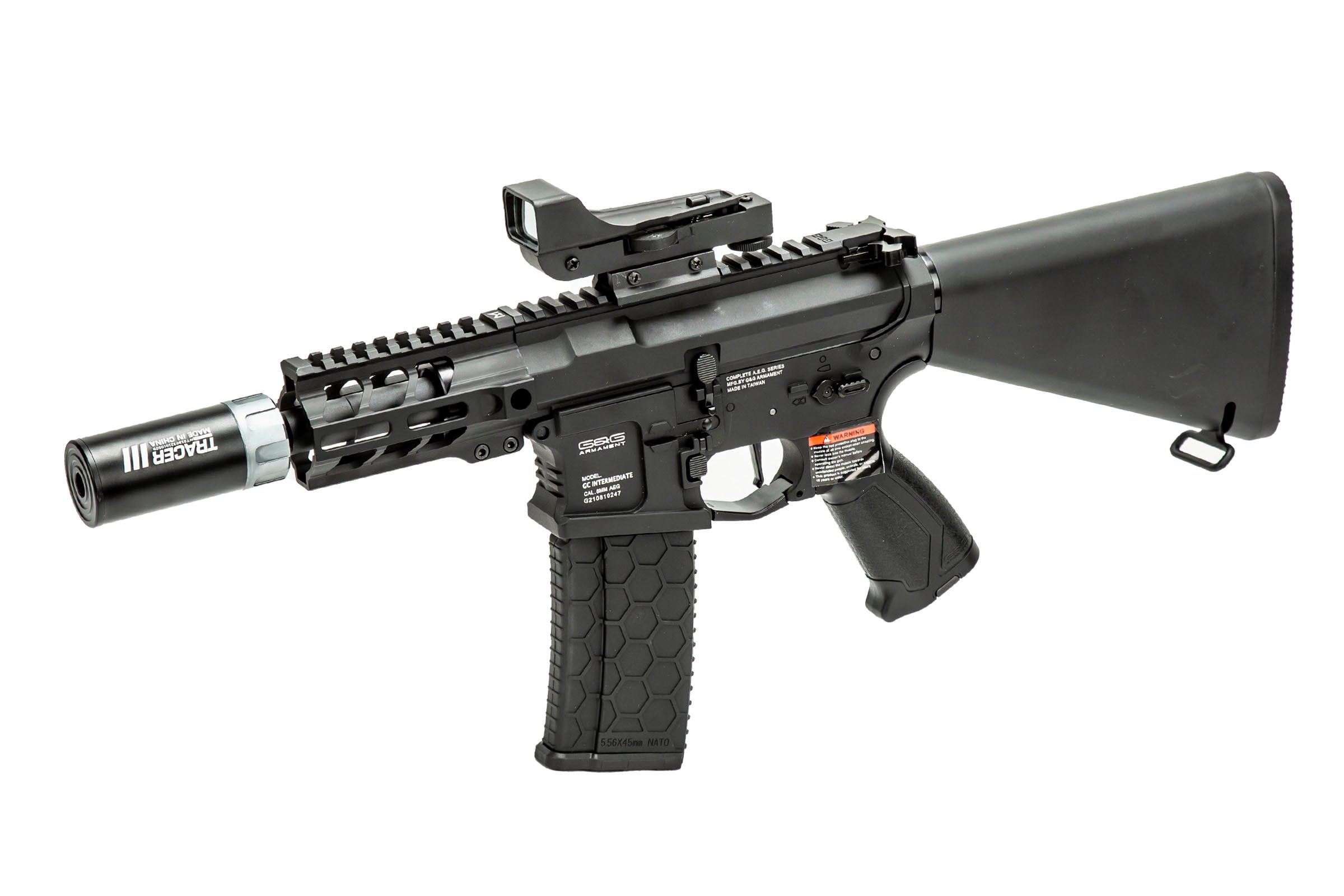 This build started from a G&G Firehawk AEG. While a little older in design the V2 gearbox has stood the test of time and the rifle makes for a solid base. The outer barrel now sports a Bravo 3.5" Tracer Unit Mod 3 to assist with spotting your shots in dark low lit settings, also who doesn't like lasers? The original rail system was also replaced by a Lancer Tactical 4" M-Lok rail system, giving the rifle a more modern appearance while offering more potential for accessories. The optic chosen for this build is a VISM Gen2 DP Red Dot Sight, a simple optic but a solid one nonetheless. The give the rifle more battery space we removed the original buffer tube assembly and in its place sits a Golden Eagle CQB Stubby stock.