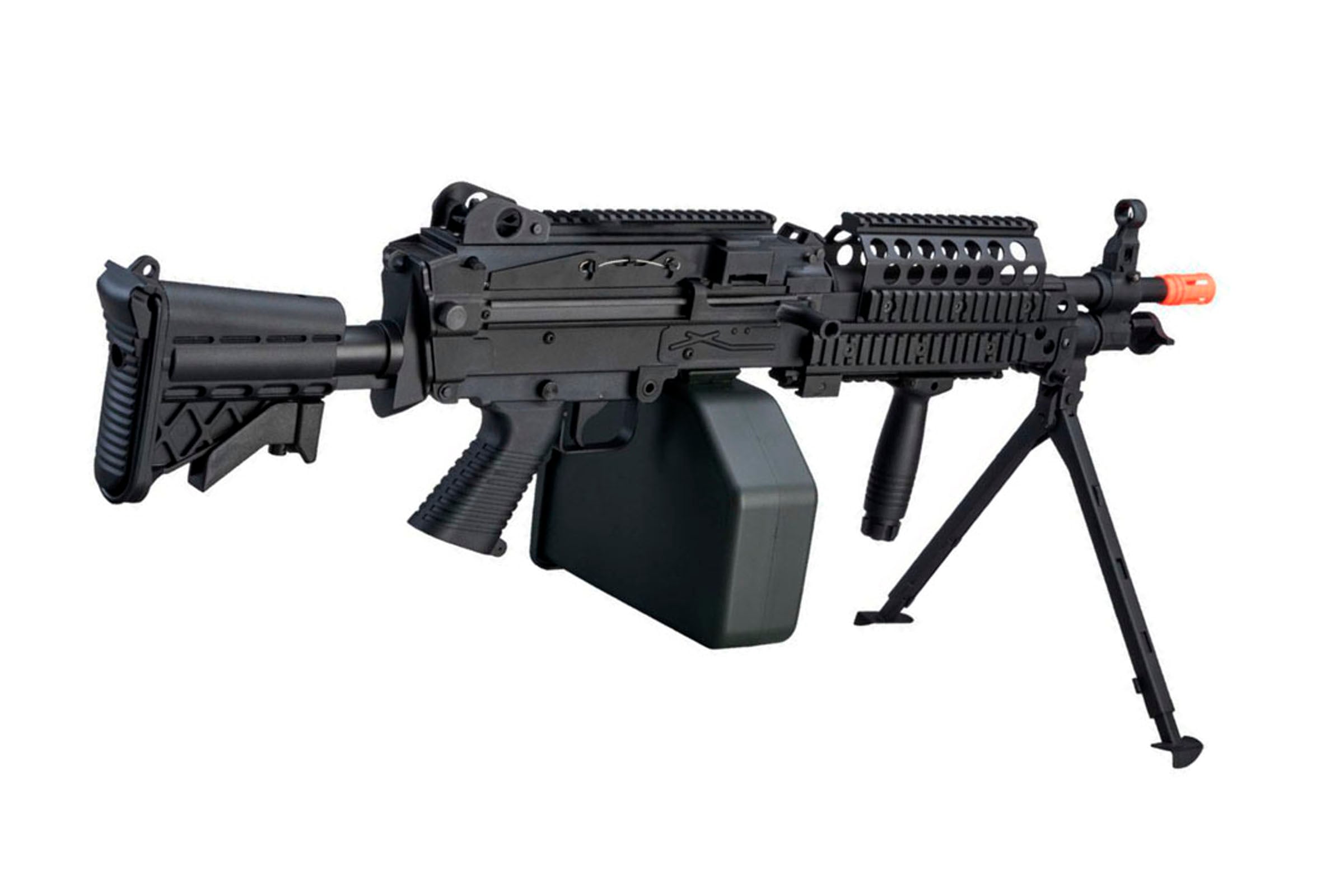 Internally, this airsoft gun was designed to perform exceptionally well out of the box and an ideal choice for many airsoft players looking to fulfill the support class role on the field. The gearbox is fully upgrade-able via the selection of internal parts available on Airsoft GI using many V2 parts and a M249 specific nozzle and trigger assembly. You can build this gun to be an absolute menace on the field, but it's already pretty close out of the box with a 2500 round automatic winding magazine letting you deliver plenty of plastic downrange without stopping to reload!