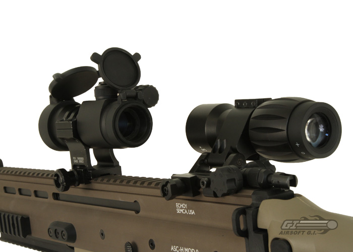 This mount is made to be used with a 3x magnifier such as the AMP 3x Magnifier Ver.2. This mount is able to be attached to any standard picatinny rail system via a clamp style system. To aid the user is disengaging the magnification on the fly, this mount is able to be quickly flipped to the side to allow unblocked vision of your red dot. This mount is made of high quality materials which lends it to be very sturdy even under rigorous conditions.