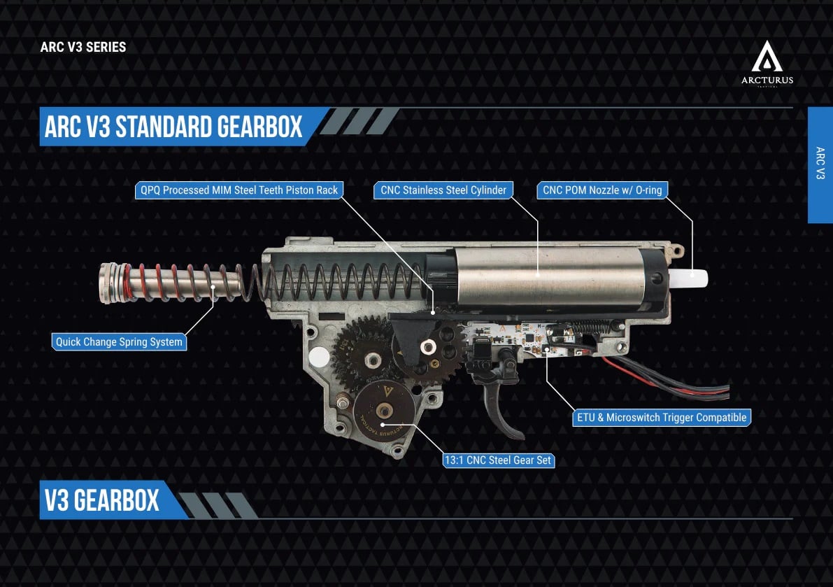 - Gearbox: Version 3 w/ Quick Change Spring