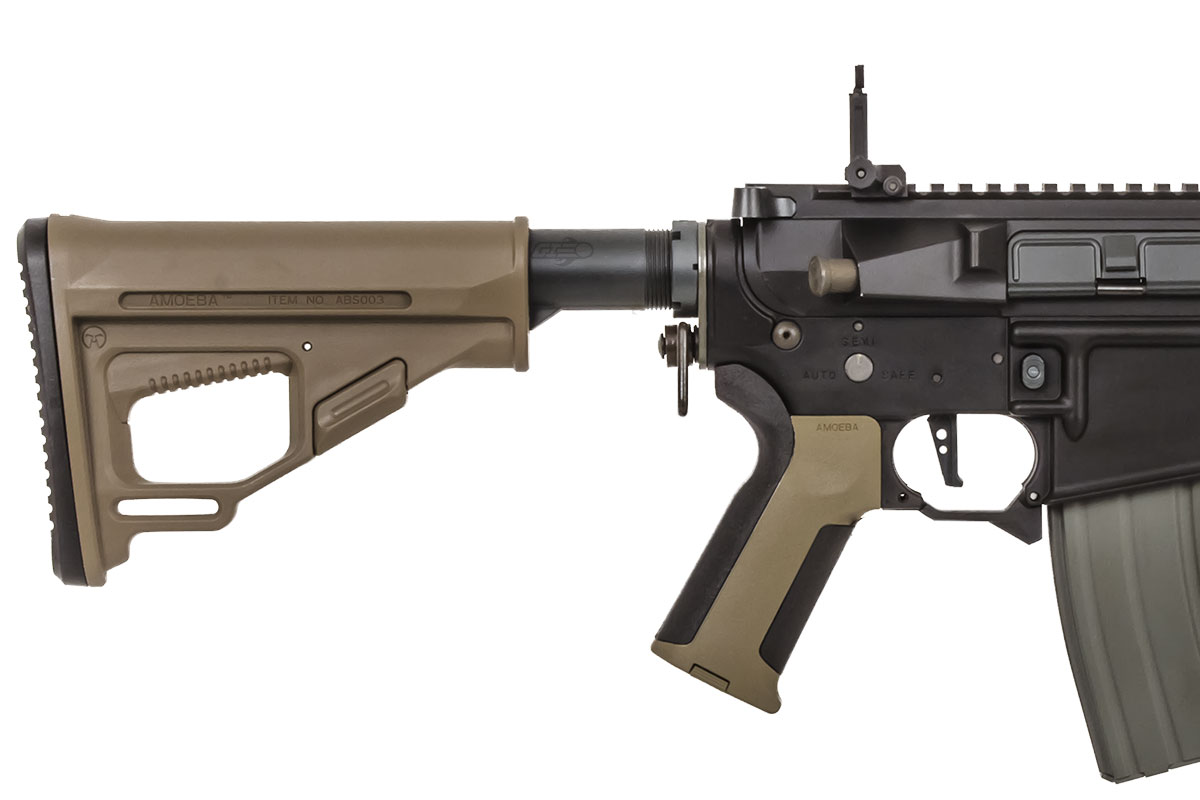 ARES has been a well known manufacturer pushing new and unique airsoft guns out in the market. The Octarms X Amoeba series features the ARES keymod hand guard, Amoeba stock and Amoeba pistol grip. This model is built with a metal receiver for a long lasting build that is not too heavy or too light. Additionally, there is a amplifier flash hider that boosts the sound of the airsoft gun to intimidate foes around you. The built in ECU ( Electronic Control Unit ) allows the user to program their specified firing modes with the ARES programming unit ( sold separately ). ARES has implemented a quick change spring system known as their Rapid Velocity Tuning System. This system makes is easier to adjust your FPS at the field with out too much hassle from taking out all your internal parts.