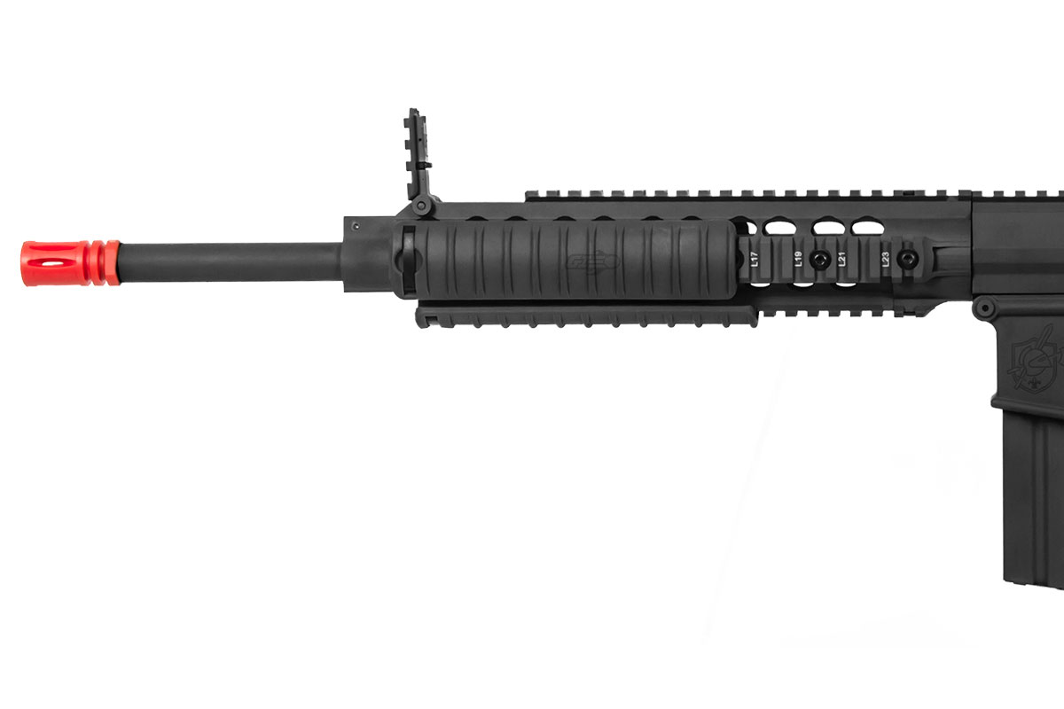 The ARES SR25 w/ ECFS Airsoft Gun is a very unique rifle in the airsoft industry that is capable of being programmed into different shooting modes. The airsoft gun will display safe and semi firing modes, but it will shoot in safe, semi and full auto at first until it is programmed. The built in ECU ( Electronic Control Unit ) allows the user to program their specified firing modes with the ARES programming unit ( sold separately ). ARES has implemented a quick change spring system known as their Rapid Velocity Tuning System. This system makes is easier to adjust your FPS at the field with out too much hassle from taking out all your internal parts. This SR25 has an ambidextrous magazine release, bolt release and fire selector that help make this rifle both left and right hand friendly. The body is constructed out of metal with licensed trademarks on the left and right side of the lower receiver. The monolithic top rail and quad hand guard rail offers the user a wide range of options when positioning their optic or other accessories needed to complete the mission.