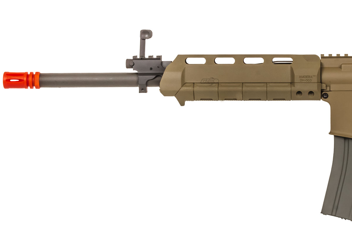 ARES has been a well known manufacturer pushing new and unique airsoft guns out in the market. The ARES X Amoeba series features a unique Amoeba modular hand guard, stock and pistol grip. This model is built with a metal receiver for a long lasting build that is not too heavy or too light. The built in ECU ( Electronic Control Unit ) allows the user to program their specified firing modes with the ARES programming unit ( sold separately ). ARES has implemented a quick change spring system known as their Rapid Velocity Tuning System. This system makes is easier to adjust your FPS at the field with out too much hassle from taking out all your internal parts.