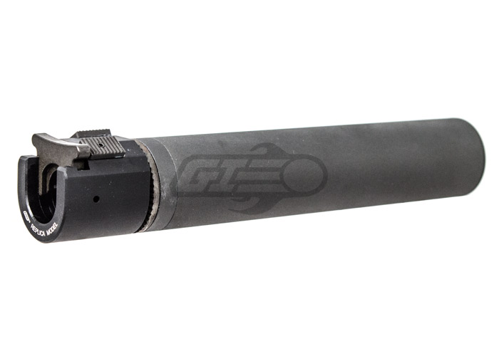 The ASG B&T ROTEX-III barrel extension tubes are fully licensed replicas of silencers from B&T AG. Of Switzerland. Made from aluminum and steel with authentic markings in a new design. Each barrel extension tube comes with a steel flash-hider (14mm counter clockwise thread) that will fit most airsoft barrels with matching thread. Each barrel extension features a QD plunger type locking mechanism that slides onto the steel flash-hider and is pressed down locking it into place. A ratchet function helps tighten the barrel extension for a firm fit. This version of the barrel extension comes in a grey finish and is the long type extension, making this suitable for covering longer inner barrels.