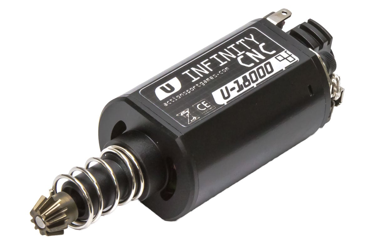 The ASG Infinity CNC U-18000 Motor is a great upgrade for any discerning airsoft tech. These motors feature CNC machined cases, endbells, and Pinion gears. The motor is wound to 28TPA, which makes it amazing for high torque builds, as the TPA rating and Neodymium magnets work effortlessly to pull back heavy springs. The motor as a spin speed of 18,000 RPM, which is slow in comparison to other motors, but the amount of torque produced more than make up for the slow turn speed. This motor works very well in high torque builds that require a lot of power to compress a spring, or in low gear ratio builds where high torque produces near instant trigger response. Overall, the ASG Infinity CNC Motor series is a top tier pick for AEG motors.