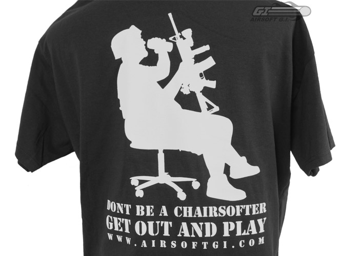 [W07D01][05999]The Airsoft GI Chairsofter Tee is made of heavy duty, 100% cotton. The front of the shirt features the Airsoft GI logo, and the back shows the silhouette of a fat, lazy, airsoft player with no desire to win. The caption underneath the silhouette reads, " Don't be a Chairsofter, Get out and Play." Show all your friends and fellow players who the #1 Airsoft retailer in the world is!