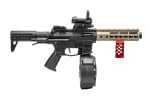 We started with a Classic Army PXG-9 and tricked it out for maximum combat effectiveness. You'll find the handguad replaced with an ARES 7" KeyMod Handguard for more modularity and longer length. at the end of that handguard we've nestled a Bravo Mini tracer to give you better BB Visibility. The handguard also has a skeletonized KeyMod grip to give you control over your rifle. Up top, you'll find the VISM V-Solar FlipDot to stay on target, and it's fed from a 1400 Round drum magazine.