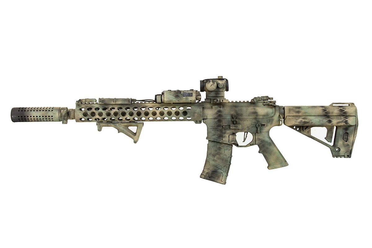 Toward the front of the Cisco MK3 rifle rests a Madbull Troy 13" TRX Battle Rail that utilizes its available rail sections to host the included accessories. Familiarize your hand positioning with the assistance of the Magpul AFG2 that allows you to comfortably grip the gun in a natural approach to increase accuracy and reduce fatigue. This setup supports the motion to press on the dual tape switch for the mini light and P15 light/laser. The P15 can be set with your preference on either the light or laser activating when pressing on the pressure pad. The flash hider has a QD mock suppressor with the custom paint job absent from the end of the muzzle to simulate the paint wearing off. Lastly, the Lancer Tactical Mini Red & Green Dot Sight comes with a quick release mount if you wanted to use the Knight's Armament Airsoft Back Up Iron Sights.