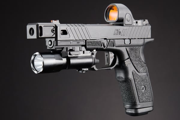 This custom OZ9 is pre-installed with a 510-lumen Atlas Custom Works X300 Ultra pistol light and an SRO Mini Red Dot Sight for fast, accurate target acquisition in any light condition. A precision 6.03mm inner barrel and adjustable hop-up system enhance range and accuracy, while the micro compensator not only improves recoil management but maintains holster compatibility. The package is completed with a rugged Code 11 13-inch pistol bag featuring laser-cut MOLLE and organized compartments for accessories and spare magazines.