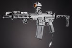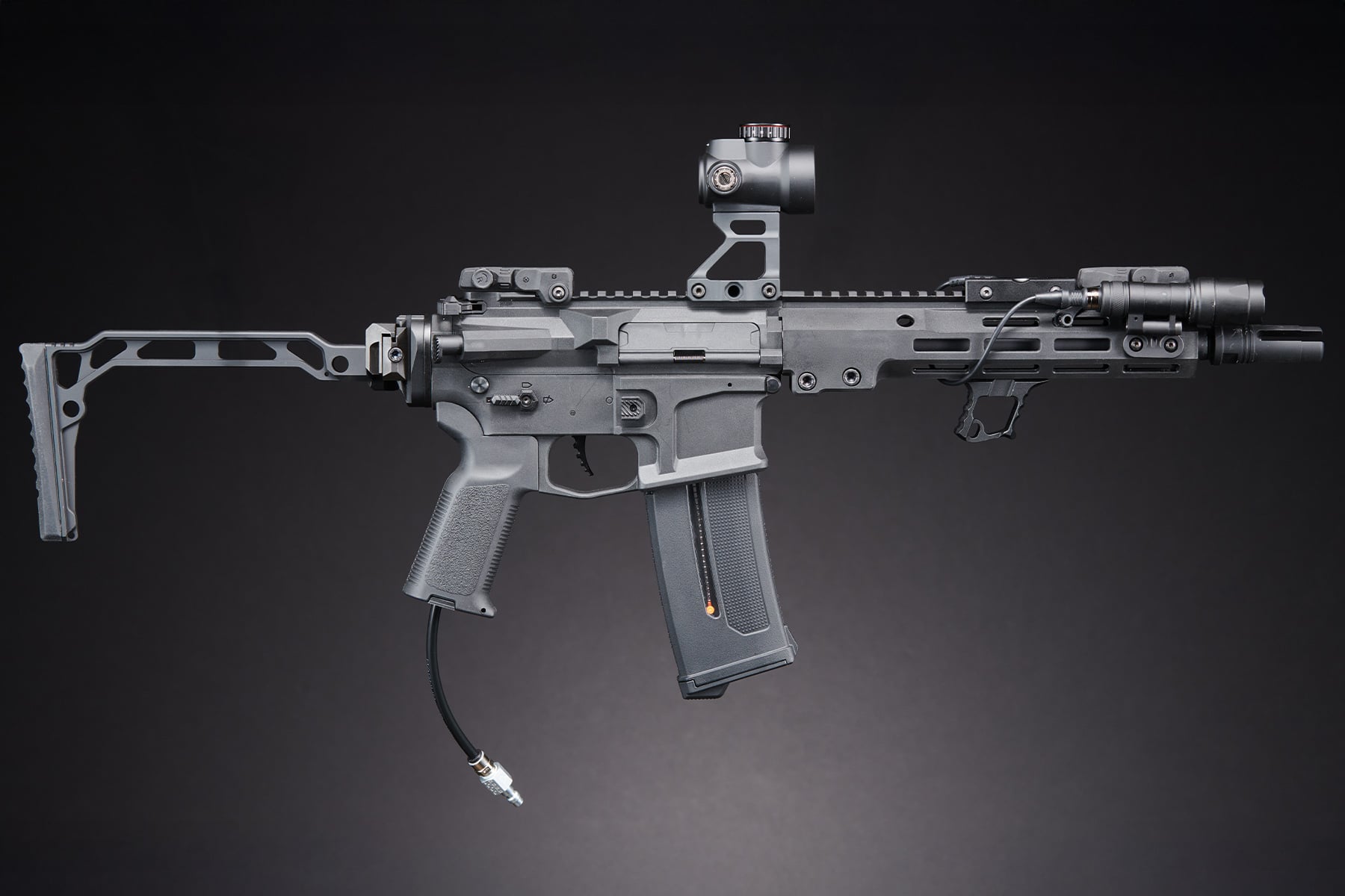 Externally, this rifle comes mission-ready with premium enhancements for both performance and aesthetics. A skeleton stock and EPM1 magazine provide a sleek, lightweight feel, while the M-LOK handguard offers room for customization. The included MRO 45-degree offset red dot sight, mounted with a matching ACW unit mount, allows for rapid sight acquisition. A 540-lumen scout light with pressure switch and dedicated rail mount ensures you're equipped for low-light scenarios. The entire setup comes packed in a durable Code 11 36-inch rifle bag with laser-cut MOLLE for gear expansion. Whether you’re playing Milsim, Speedsoft, or weekend skirmishes, this setup is ready for any mission.