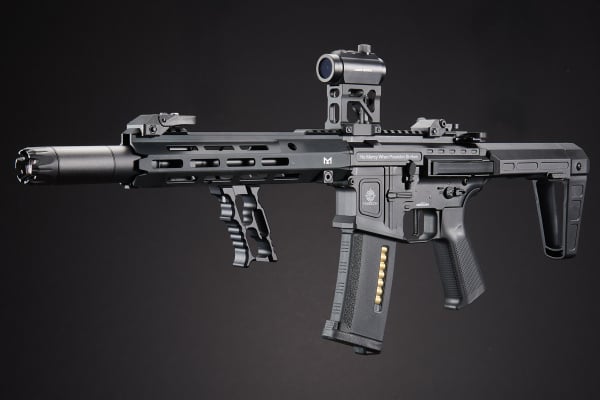 Externally, the Ernesh features an LT 1x22 Red Dot Reflex Sight mounted on an ACW riser for faster, more natural target acquisition. The vertical foregrip from ACW enhances handling and weapon control, especially in dynamic movement or tight spaces. Whether you're clearing rooms or holding angles, this custom AEG is built to give you the tactical edge with a streamlined, mission-ready design.