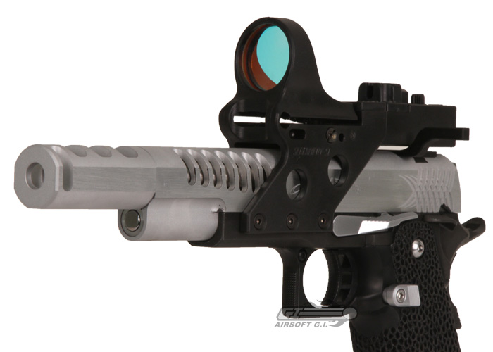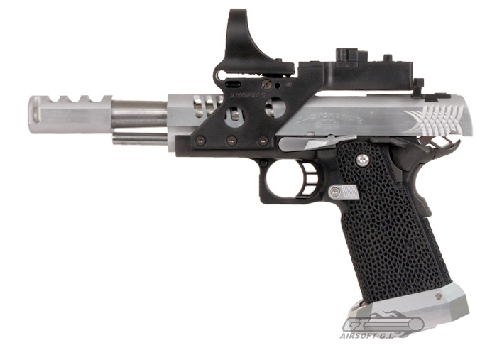 The Airsoft GI Custom F-Chu Too is another hand built pistols from our Master Technician Frank Chu. Frank is an avid IPSC shooter, and his knowledge and experience shooting real guns went into the design of the F-Chu Speed Racer. The base gun is a Tokyo Marui Hi Capa 5.1. The metal slide, compensator, magazine well, magazine base plate, magazine release button, slide catch, and cocking lever are all machined components from aluminum. The grip is a custom work of art that Frank stippled and cut with his own hands. Everything on this gun is built for speed. The red dot sight and integrated mount are included for faster target acquisition. The cocking lever makes pulling back the slide extremely easy and ensures the shooter a solid grip. The magazine well increases reloading accuracy. Finally, since all of the moving parts are CNC machined from lightweight aluminum it takes energy to get them moving. This is a high speed gun inside and out, but it's going to take a high speed shooter to use this gun to it's full potential.
