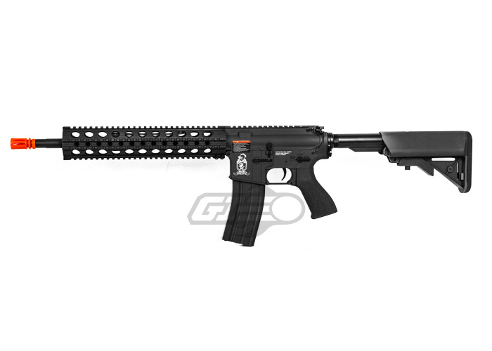 Never before have we built a gun with such a high value per dollar ratio. The base gun is a special Combat Machine Blowback M4 with a crane stock that's wired to the back. The brilliant techs at Airsoft GI have fitted a One Piece Barrel and 12" Free Float RIS. This is a part of a new line up of guns to be manufactured by Airsoft GI. We've worked out a special program with Combat Machine to build us a special pneumatic blowback M4 with a crane stock, sling mount, and the wires to the back, so we can eliminate the need for a PEQ box and keep a clean look. The Combat Machine was carefully chosen for their high quality, reliability and incredible value. We've dropped the G4 straight onto the ground from 8ft and 9ft with no visible damage to the body, this is the strongest plastic receiver on the market. Additionally, with the innovation and imagination from the Airsoft GI technical team we are building some of the highest quality guns that money can buy.