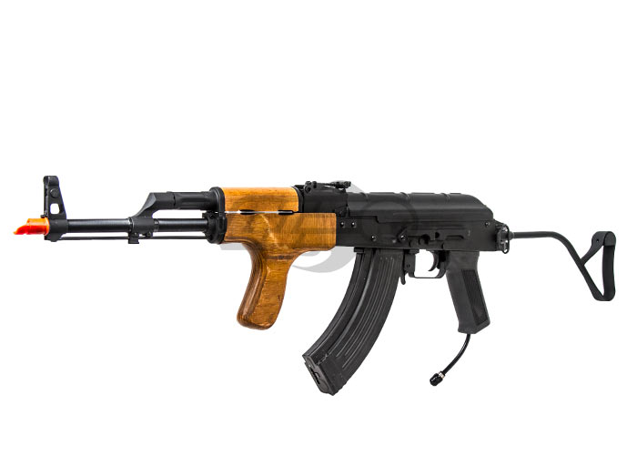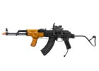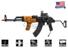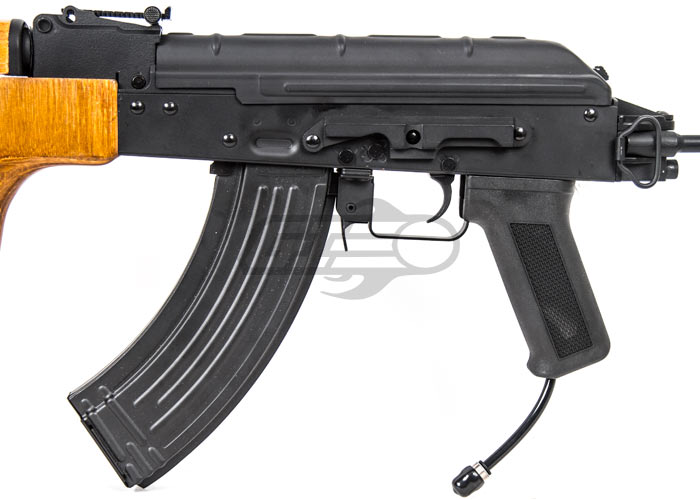 The Airsoft GI Custom Polar Star Fusion CM050 Aims AK Airsoft Gun features PolarStar's revolutionary Fusion Engine. The Airsoft GI Tech's have installed the Fusion Engine into a CYMA CM050 Romanian AK. The Romanian AK features a skeleton side folding stock along with an integrated real wood vertical grip. Internally, the fusion engine completely takes the place of the AEG's gearbox as a direct drop-in, which means that you no longer have to ever worry about stripped gears, broken pistons, or leaking cylinders. It is powered via a High Pressure Air (HPA) setup and only requires a small battery (7.4v-9.6v NiMH or Lipo recommended) to power the onboard computer, which is referred to as the Fire Control Unit (FCU), and is responsible for adjusting all of the features of the gun. Optional color-coded nozzles are available from PolarStar to be able to move the maximum FPS range either up or down. The PR-15 also uses a standard AEG-style hop-up and inner barrel design, which means it can still accept a large variety of standard AEG upgrade parts.