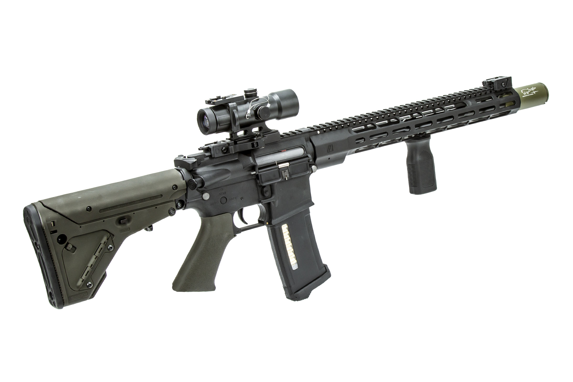 We've started with a Lancer Tactical LT03B for the incredible gearbox and rotary hop up, then proceeded to bless this blaster with all of the trimmings! You'll find a PTS ZEV 14" Wedgelock Rail, NCStar CPO Scope, Element Grip, an Upgraded M1 high speed motor from Classic Army, The Classic Army tool less grip for easy motor swaps and maintenance, and we're feeding it from a PTS EPM Magazine, one of the best in the business! We've added a Noveske Amplifier from Madbull for the most aggressive looks and sound, and even swapped the triangle sight nobody wants for the Low profile gas block so good you'll wish you had it on every gun! Internally, we've even upgraded you to a stainless steel tightbore and a madbull blue hop up bucking to let you sling the heaviest of bb's down range and know they'll hit their mark.