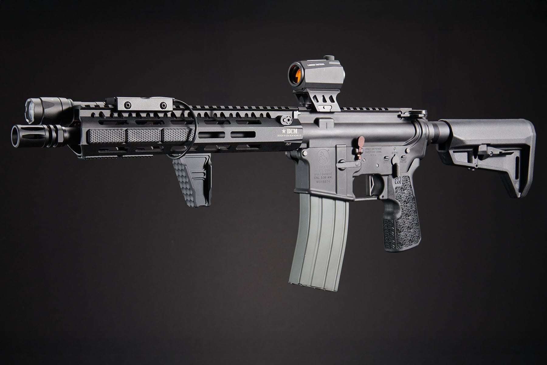 - BCM 10" M-LOK rail, Atlas RSAC foregrip, and Tac-9 stock for modular accessory mounting and ergonomic handling