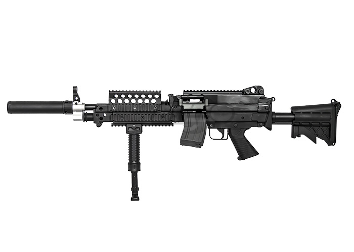 The A&K MK46, a common support platform, designed to provide the ultimate firepower with consistency and reliability. Internally, the OEM gearbox has been removed and fitted with a Polar Star Fusion Engine. The Polar Star Fusion Engine Drop-in Gear Box is the perfect way to convert your favorite AEG to the performance and reliability of Polar Star's high pressure air (HPA) system. The fusion engine completely takes the place of the AEG's gearbox as a direct drop-in, which means that you no longer have to ever worry about stripped gears, broken pistons, or leaking cylinders. It is powered via a High Pressure Air (HPA) setup and only requires a small battery (7.4v-9.6v NiMH or Lipo recommended) to power the on board computer, which is referred to as the Fire Control Unit (FCU), and is responsible for adjusting all of the features of the gun. Optional color-coded nozzles are available from Polar Star to be able to move the maximum FPS range either up or down. Externally, the entire gun is constructed out of metal to provide an extensive amount of durability as well as heft similar to the real firearm counterpart. The rail system, provides more than enough remove for mounting flashlights, lasers, vertical grips, etc. needed. To finish off the gun, a Magic Box Miracle Barrel has been installed in conjunction with a Madbull Blue Bucking to increase the overall range output and velocity consistency.