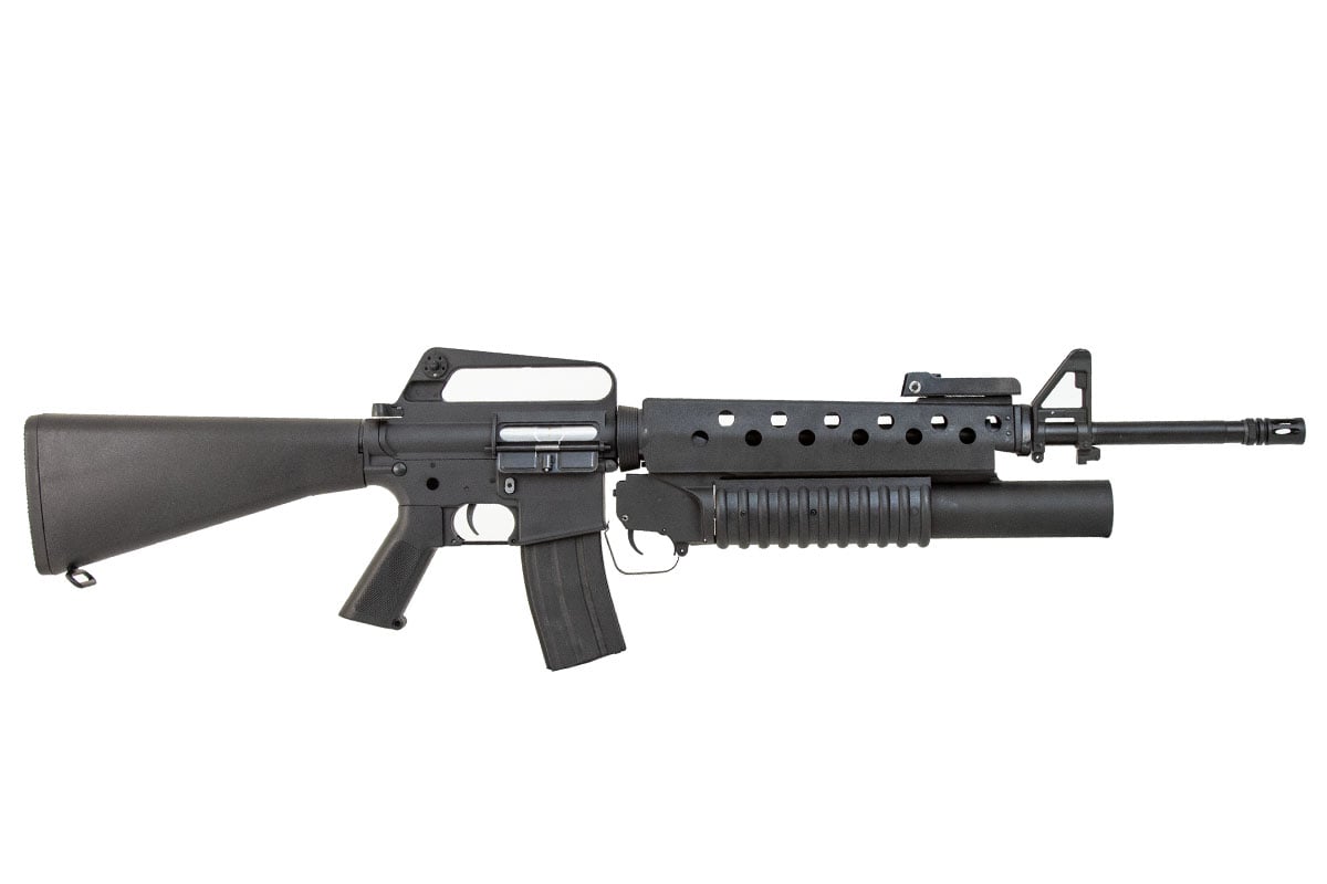 We have built this bad boy to replicate the gun models you may have seen in some of your favorite hit movies like Scarface and Predator. This particular model has yet to defend against attackers with its CA Military Style M203 grenade launcher. Be the one and only to take on the assault and defend your name with honor! The M203 is directly attached onto the bottom area of the PTS Legacy CAR-15 N-23 PDW. On top, there is a G&P Upper Handguard to work in conjunction with the launcher. It bridges the gap that is created between the standard handguard and the m203 launcher. Also, the heat shield features a range estimating sight that is used to aim the m203. The base airsoft gun has a vintage style "Model 607/VN" style receiver with a fixed carry handle and no forward assist.