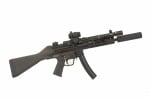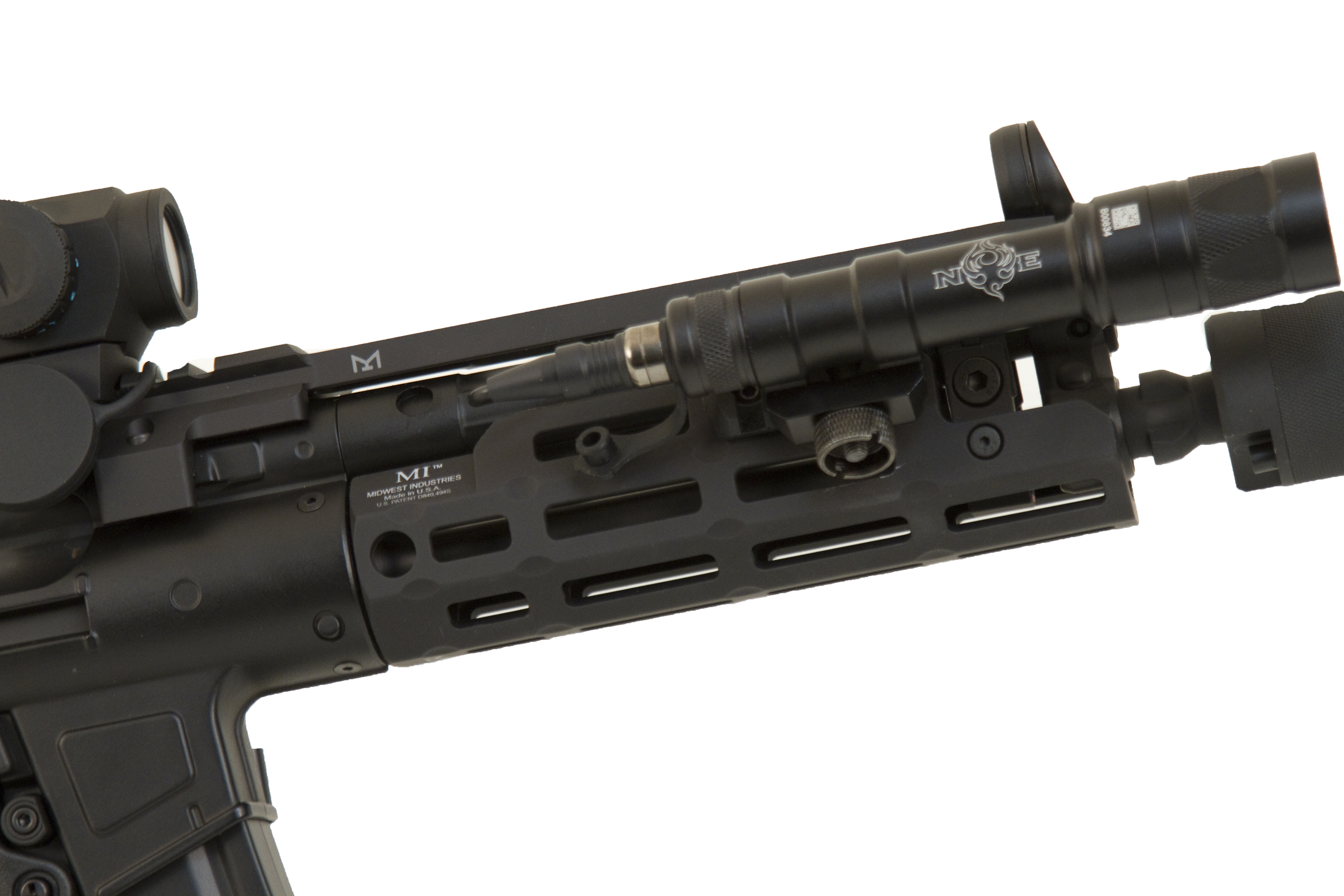 This MP5A4 SWAT AEG features a Handguard and Top rail from Midwest Industries, one of the best aftermarket parts manufacturers in the firearms industry. These accessories allow for the fitment of several accessories to the MP5 where you otherwise would be unable. These accessories include an AIM sports Micro Red/Green dot, a Tac9 M600W Scoutlight, and a Classic Army tracer unit on the muzzle.
