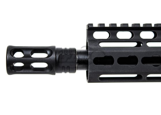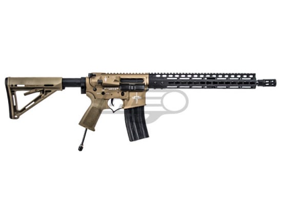 The Airsoft GI Custom Polar Star Desert Carbine Airsoft Gun features PolarStar's revolutionary Fusion Engine. Externally, the Airsoft GI Tech's have added a Full Metal Metal Upper and Lower Receiver, 14.5" outer barrel in accompany with the Madbull Noveske 13" NSR Rail and Go Gun Super Compensator to give the gun a unique appearance. To finish off the gun, a plethora of Magpul furniture has been added to replace the standard pistol grip and retractable stock offering the user a better shooting platform. Internally, the fusion engine completely takes the place of the AEG's gearbox as a direct drop-in, which means that you no longer have to ever worry about stripped gears, broken pistons, or leaking cylinders. It is powered via a High Pressure Air (HPA) setup and only requires a small battery (7.4v-9.6v NiMH or Lipo recommended) to power the onboard computer, which is referred to as the Fire Control Unit (FCU), and is responsible for adjusting all of the features of the gun. Optional color-coded nozzles are available from PolarStar to be able to move the maximum FPS range either up or down. The PR-15 also uses a standard AEG-style hop-up and inner barrel design, which means it can still accept a large variety of standard AEG upgrade parts.