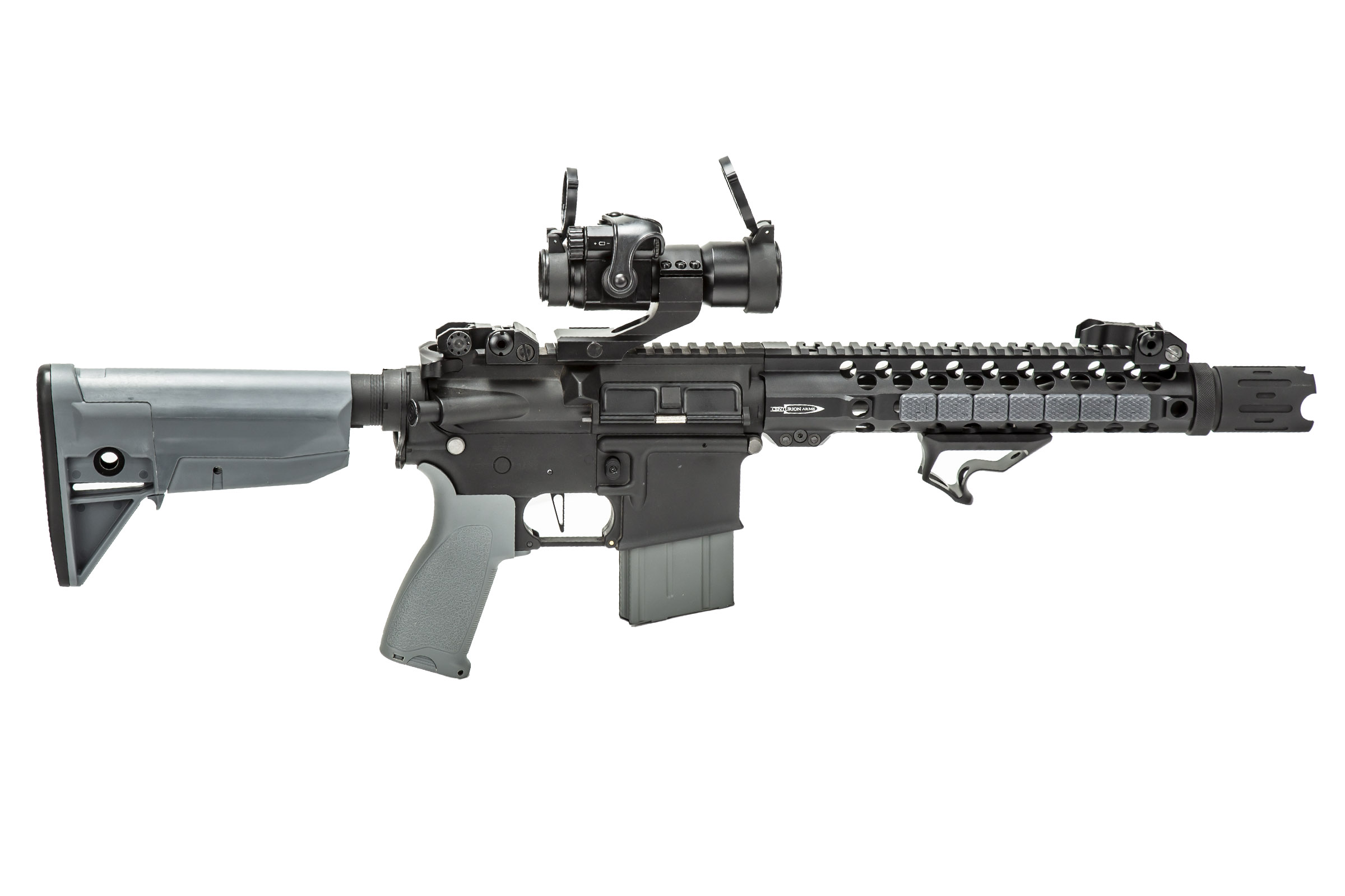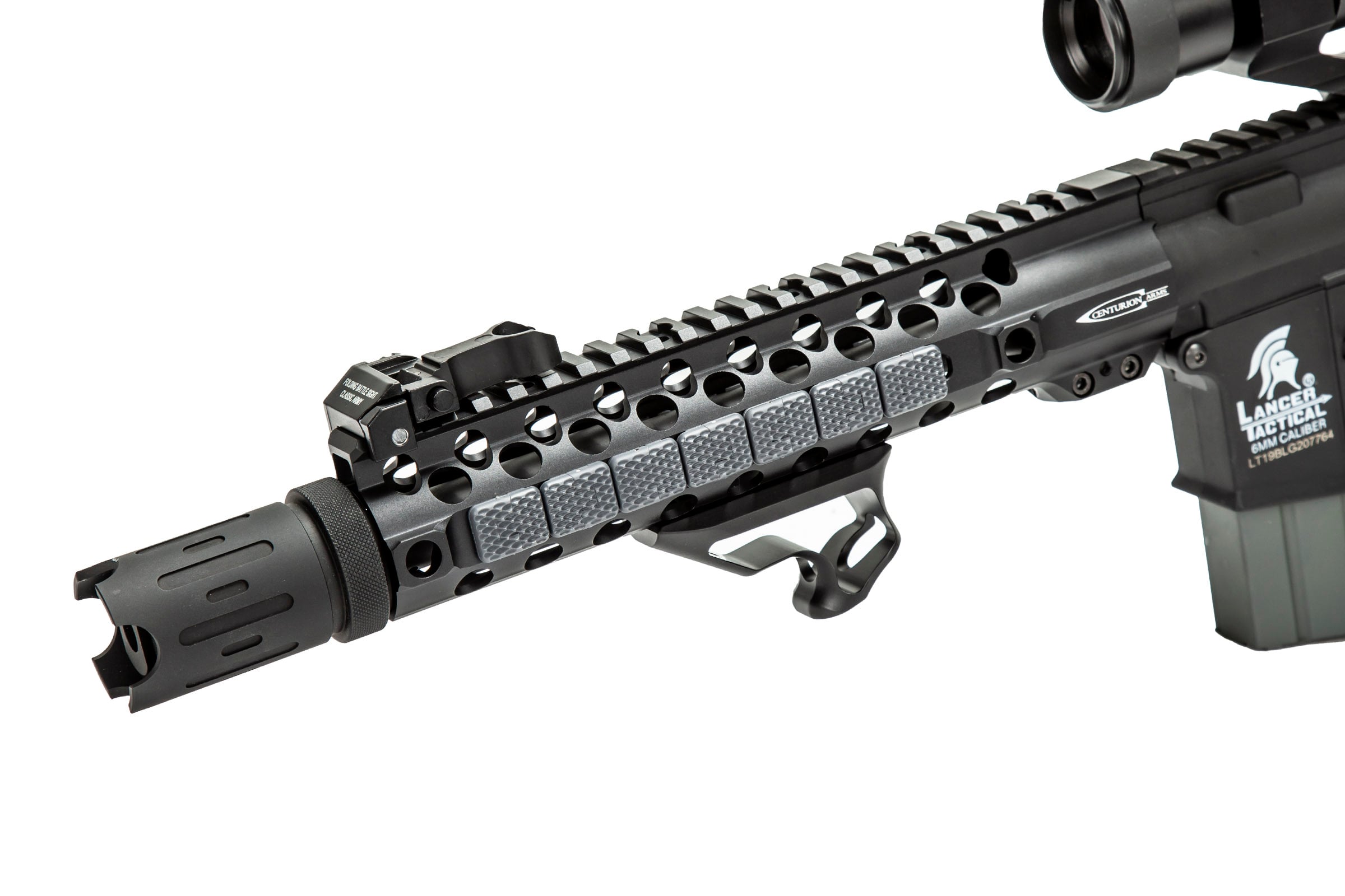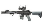 The Riot started its life as an LT-19 from Lancer Tactical, but we've decked it out to the nines for maximum chaos creation. You'll find a new CMR rail, pistol grip, and accessories galore. We've added a new Red Dot sight, M-lock covers in gray to match the new stock, and a gray pistol grip to round out the color change. You'll also find a new hand stop to maximize your grip.