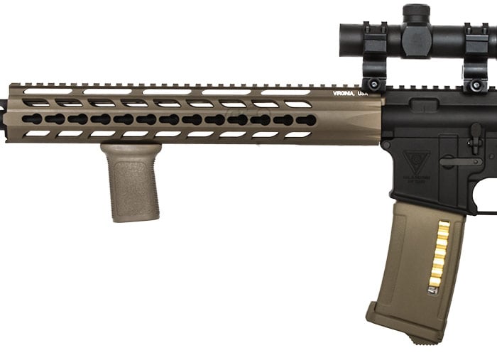 Take control of the battle arena with the Airsoft GI Custom Theokoles AEG Airsoft Gun. The airsoft gun features a light weight Krytac Defiance TR113 13" KeyMod rail system with enough space to add rail segments for additional tactical accesories. The included ASG B&T ROTEX - III Barrel Extension Short/Tan provides a stealthy and unique appearance for the airsoft gun. Increase stability and comfort with the included BCM Vertical Grip KeyMod, MFT Industries ENGAGE Pistol Grip and MFT Battlelink Minimalist Stock. The Madbull ACE Licensed LiPo Battery Buffer Tube allows the airsoft gun to accept stick lipo batteries for a low profile design. Internally, the tech department has done a great job tuning and installing parts for high performance output. The PTS 150rd (EPM) magazine sets this airsoft gun apart with its distinguished design. Additionally, the inlcuded optic assists in aiming at targets on the field. Add the Airsoft GI Custom Theokoles AEG Airsoft Gun into your airsoft gun armory today!