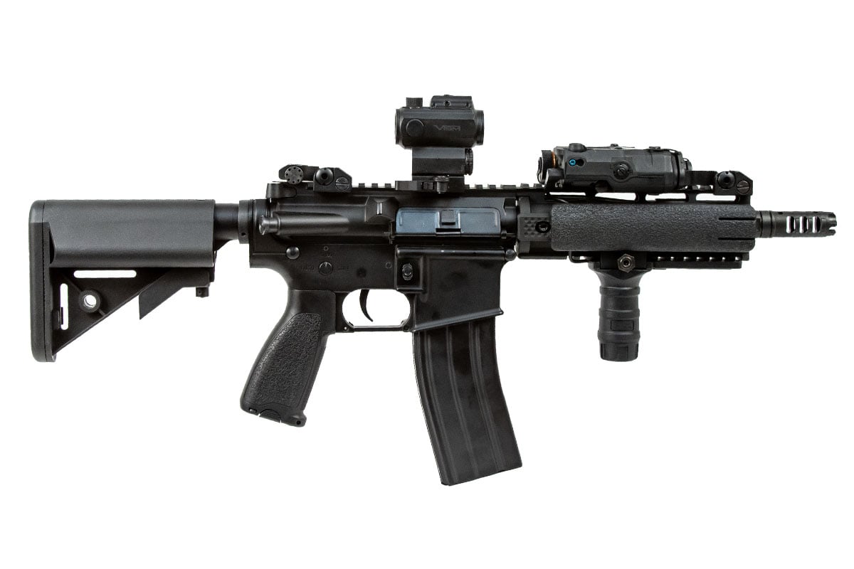 Package Includes: Gun, Magazine, Optic, PEQ Flashlight/Laser, Foregrip