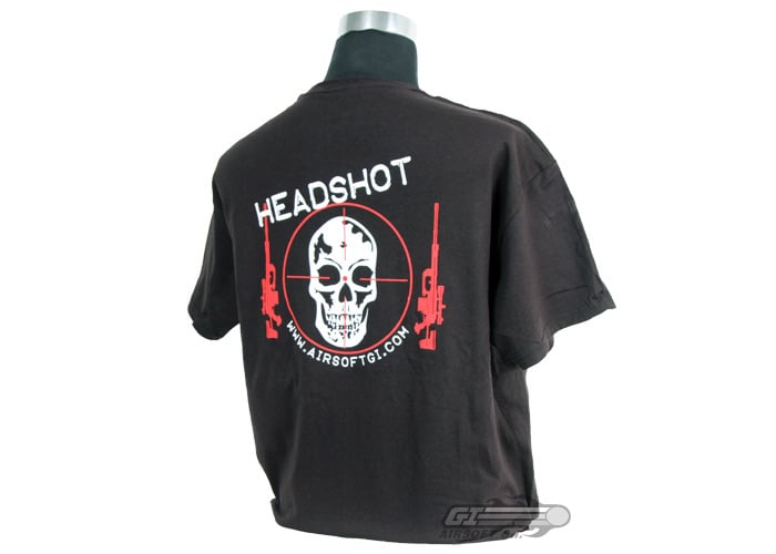 [W08D01][06013]The Airsoft GI Headshot Tee is made of heavy duty, 100% cotton. The front of the shirt features the Airsoft GI logo, and the back shows a skull inside a crosshair with two sniper rifles on the left and right side. The caption underneath the skull reads, "www.airsoftgi.com." Show all your friends and fellow players who the #1 Airsoft retailer in the world is!