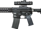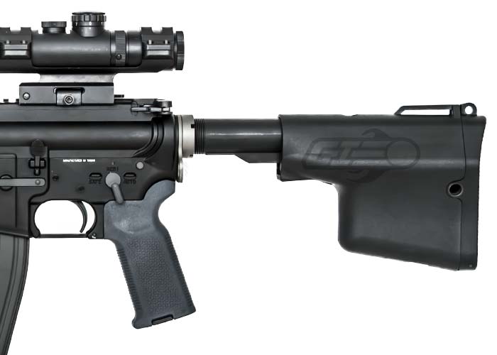 The Airsoft GI PTT Jager (German for Hunter) is another well built rifle with the Troy Keymod 13" RIS. The KWA LM4 PTR GBBR is a game changer for the airsoft world and is an excellent base for this build. The LM4 PTR brings together two characteristics of gas blowback rifles that traditionally remain separate, affordability and reliability. The KWA LM4 PTR has taken many years to engineer and assemble and it's finally ready to come to market. Once our techs got their hands on the LM4 they had to turn it into something amazing, and as usual they did. First they took the stock plastic hand guards and swapped them out for the URX 3 rail system. They did this for three main reasons; first off the rail system gives the user the ability to mount a variety of accessories to the gun such as vertical grips, flash lights, cameras or even lasers. The other advantage of the rail is the durability and stability that the rail offers. Typically, a standard plastic hand guard no matter how well made is not extremely durable and can crack or become damaged, that typically does not happen with the real Troy keymod 13" Rail. The third and final advantage is the increased length of the hand guard. The 13" interface allows the user to employ a variety of shooting stances to increase the control over the GBBR. To increase the comfort and ergonomics of this GBBR the techs installed the Madbull Troy Battle Axe stock to replace the standard LE style stock. Also included with this Perfect Tactical Trainer is the NC Star XRS Series 2-7X32 Compact Scope for engagement at a distance. Internally, the techs have tuned the compression components to produce a more consistent output velocity. Overall, this is another great build from our tech department featuring the KWA LM4.