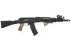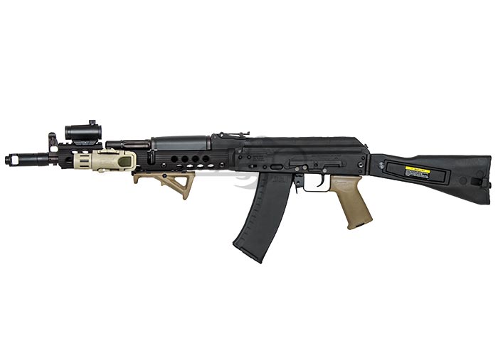 The Airsoft GI PTT Drago is one of the few custom rifles based off the KWA AKG 74M. The KWA AKG-74M is an ATF approved gas blowback AK style rifle that was designed to accurately simulate the AK platform. It features a full metal alloy receiver and high impact polymer handguards, pistol grip, and full folding stock. An AK side rail mount on the receiver allows users to expand their platform with AK specific mounts and accessories. Realistic construction means that the rifle functions and operates identically to its real firearm counterpart. The blank fire mode built in the AKG-74 magazine allow users to train safely without chambering a round. Powered by the KWA Force Velocity engine, the KWA AKG-74M is a strong reliable rifle for those interested in training with the AK platform. Once our techs were able to get their hands on this amazing rifle, different possibilities for custom setups came into mind. Instead of the traditional AK handguard, a real firearm Troy Industries AK Rail was installed to offer the user options for mounting rails and other accessories. Accessories such as the included Magpul Angled Grip and Lancer Tactical Weapon Light. Last but not least, the Magpul MOE Grip has been installed for more comfort when firing due to the straighter angle. Overall a well built and versatile rifle for multiple situations.