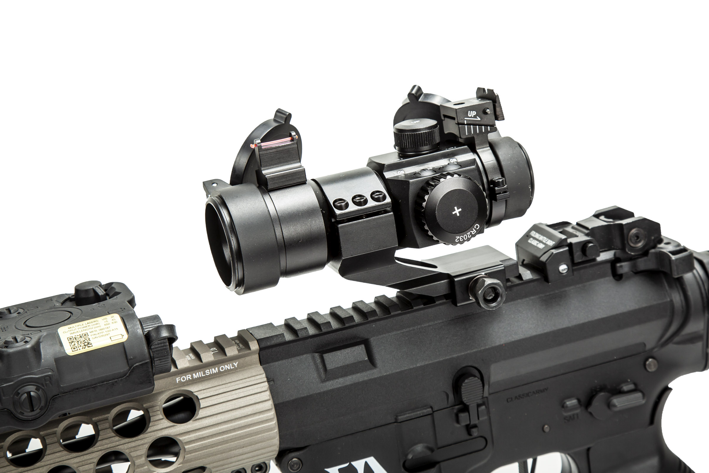 We started with a Classic Army Skirmish rifle to make use of it's light weight durable polymer body. We swapped the handguard to a Madbull Troy 9" TRX rail to give you a sleek aesthetic and comfy grip. You'll even find a Lancer Tactical PEQ15 laser, and a new Red Dot scope to go with it. The barrel's been capped with a SilencerCO licensed Blast Shield on the muzzle, and a TAc9 MOC grip to keep a hold of the gun.