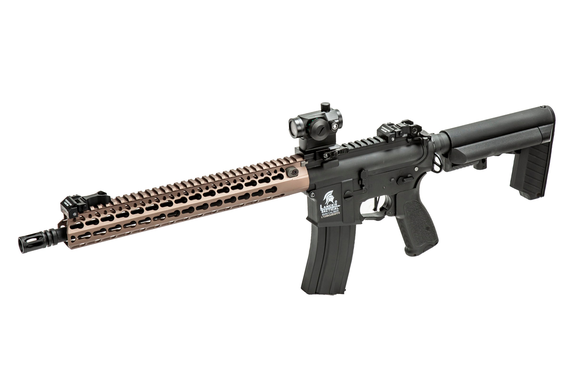 This custom started out life as just an ordinary LT-25 Gen2 interceptor, a poly-bodied SPR best suited for medium to long range engagements. The original rail has been replaced by a Tac 9 Industries 13" BR Rail System with a few little bonuses attached. First we have an Opsmen 800 lumen flashlight that'll make searching for enemies even in the dark a breeze. For a better sight picture we've added a Lancer Tactical Mini Red & Green dot sight that features a QE mount, allowing the user to attach and reattach incredibly quickly. This is an incredibly convenient feature for storing and transporting. The LCT LTS stock makes for an incredibly stylish profile while still offering a decent amount of battery space.