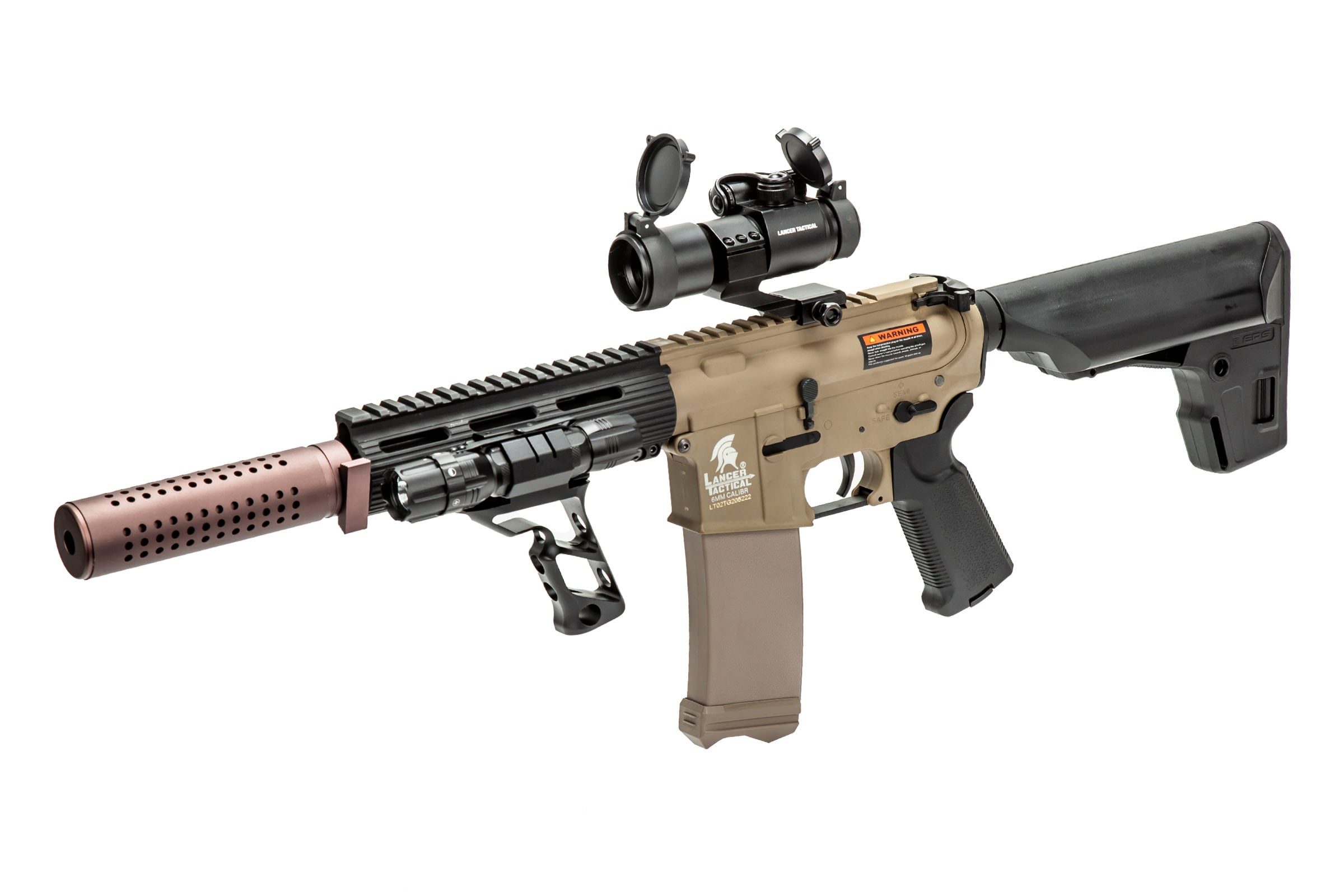 That's why a Lancer Tactical MK18 Gen2 was chosen as the base for this workhorse. Seeing as you'll be holding this rifle up for a while, we installed a G-Force pistol grip, PTS EPS, and a Ranger Armory lightweight fore grip for extra comfort. The Lancer Tactical optic equipped sits on a cantilever mount, making it just the right height for quick yet precise alignment with the eyes. Even in the dark this rifle won't fail as it comes included with a Vism pro-series green LED flashlight. And if you need even more of a compact profile, the Lancer Tactical QD barrel extension can be removed and reattached with ease.
